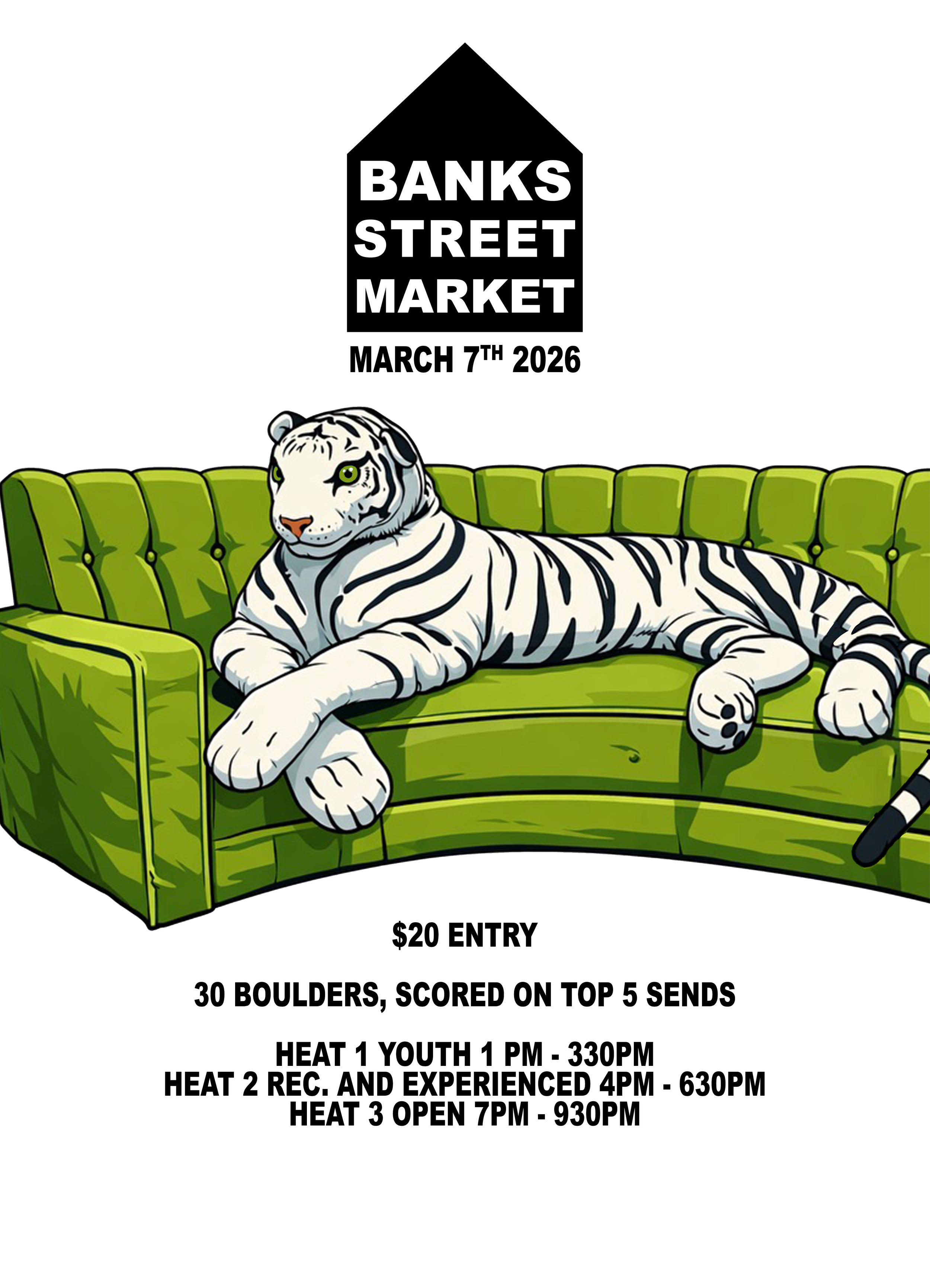 March 7th, 2026. $20 entry fee, old school scramble format, 30 boulders, top 5 count to overall score.
